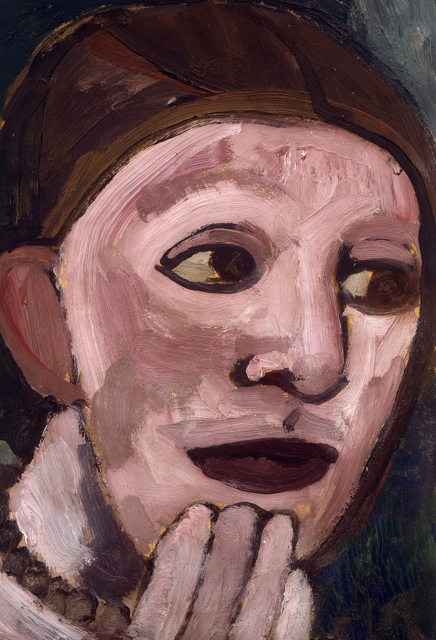The exhibition Paula Modersohn-Becker: Pioneer of Modern Art at the Bucerius Kunst Forum shows how the artist used everyday motifs taken from her surroundings in Worpswede and freed them from clichés to reveal her own understanding of modernity. Modersohn-Becker stripped her recurring motifs – such as children and women, self-portraits, still lifes and landscapes – of their familiarity, removing all ornamental details and aspects of genre painting in order to establish a simplified, universal language of forms. Her portraits of children are characteristic of this approach: by absenting them from their everyday lives and taking away their individuality and external appearance, she endowed them with a certain dignity. In order to effect an estrangement of the familiar, Modersohn-Becker abstracted facial features to the point that they appeared mask-like. A self-portrait of the artist is presented as an example of this technique. While working on it, she created monotypes using first newsprint, then the back of a letter, which she continued to refine. In the final work, a semi-transparent mask is all that remains of her facial features; the individuality of her features has been stripped away as far as possible and distanced from the richly detailed original. These three works, which are shown together for the first time, at once reveal the artist’s unique, methodical approach and allude to her turn to abstraction in her final works.